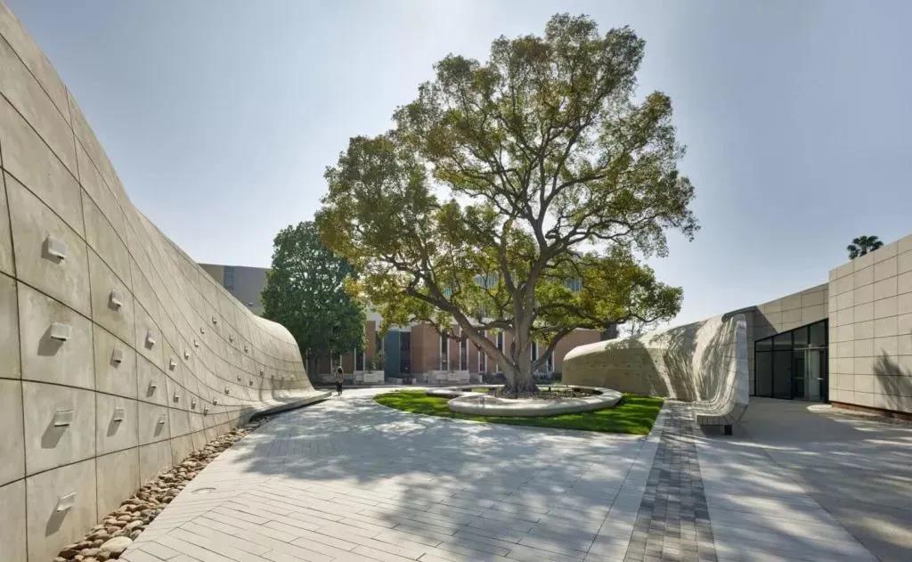 游客可以在樹蔭下呼吸新鮮空氣。在兩堵混凝土墻的表面安裝了75個領導的背光板,以突出該設施的許多