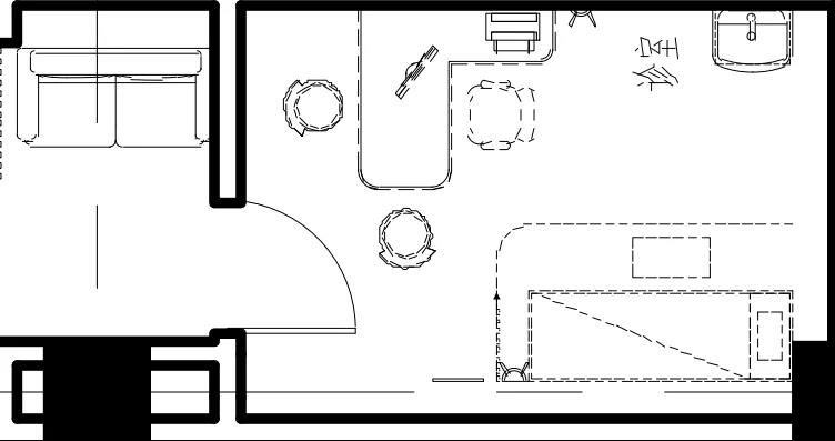 建議進行標準化布置,以滿足基本診療的需求。向內平開門并靠深側墻,門方向深側墻對側設置診桌,診桌后方同側墻距離1米以外處布置洗手盆,防止水外濺腐蝕診桌。建議使用感應式水龍頭設置,洗手盆下水管做U型彎方便檢修,洗手盆下做美觀的裝飾柜。水池上方30-50厘米以上貼墻梳妝鏡,保證門診醫生以良好的形象服務患者。檢查診床設置在洗手盆對側深側貼墻擺放,婦產科、耳鼻喉科、眼科等檢查床(椅)設備可布置在同側,朝向可根據醫生診療習慣布置。檢查床必須設置隔簾,保護隱私。空調出風口宜設置在診室門上,且側送風為最佳,可避免直吹醫生或患者,且保證室內空氣循環。