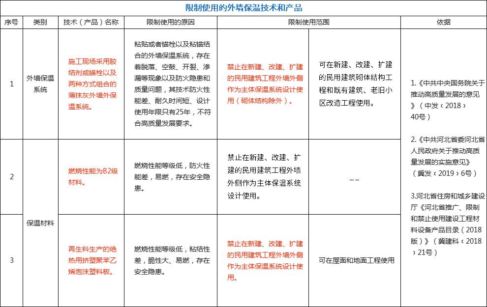 禁止使用范圍:禁止用于新建的住宅、公共建筑工程的外墻外側作為主體保溫系統設計使用。